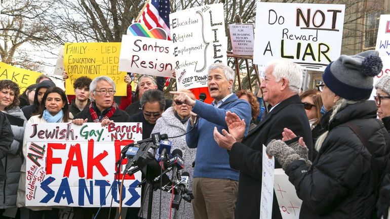 Earlier Thursday, more than 200 community residents protested outside Nassau criminal court in Mineola at an event co-sponsored by several Democrats, chanting "we deserve better" and holding signs reading "Do Not Reward a Liar" and "Santos Lies. Democracy Dies."